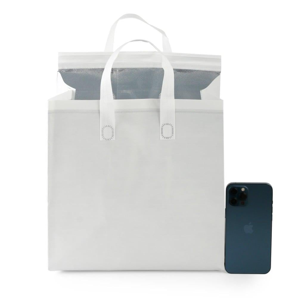 كيس ورق مبطن بالألمنيوم لحفظ حرارة وبرودة الطعام لوقت أطولهل تعاني من شكاوى العملاء وانزعاجهم بسبب وصول الطعام متأثراً ببرودة أو حرارة الجو الخارجي؟إذاً جرب الأكياس الحرارية العازلة للحرارة والبرودة من مخازن التغليف، مبطنة بطبقة ألمنيوم لحفظ حرارة وبرودة الطعام لفترة أطول.مميزات واستخدامات الأكياس الحرارية طبقة الالمنيوم مانعة لتسرب السوائليمكن تنظيف الكيس بسهولة واستخدامه مرة أخرىيحتوي على غطاء ذاتي اللصقمزود بمسكتين عريضتين لتسهيل حمل الكيسخيار مناسب لحمل الوجبات الساخنة، علب الآيس كريم و المشروبات الباردة المعلبةمناسبة للمطاعم، المقاهي، المشاريع المنزلية للطعام، الاستخدام الشخصي، ولشركات توصيل الطعاممواصفات الأكياس الحراريةالطول:30 سمالعرض: 20 سمالارتفاع: 32 سماللون: أبيضالكمية: (6) أكياس حرارية