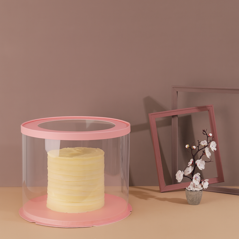علبة دائرية شفافة للهدايا والكيك المرتفع بغطاء وقاعدة لون وردي ونافذة علوية